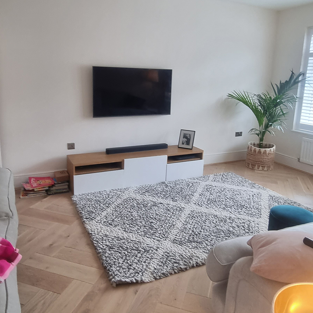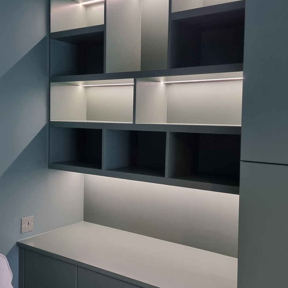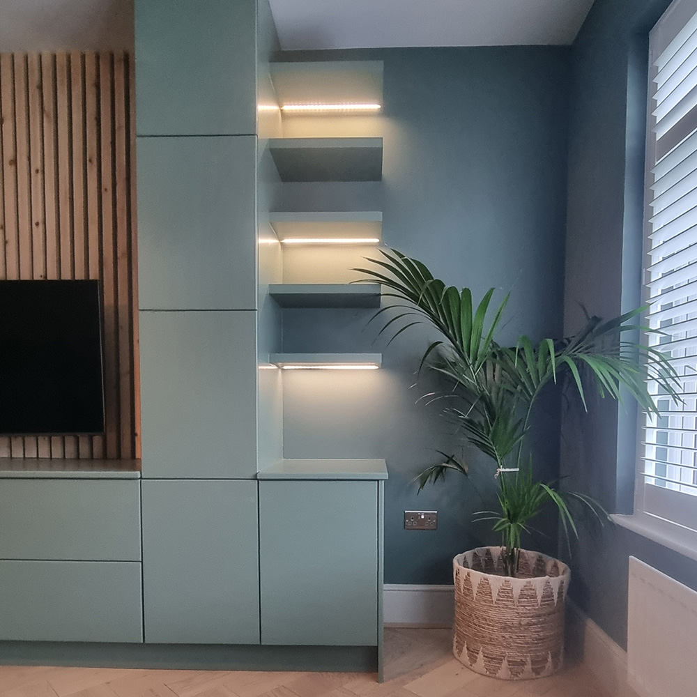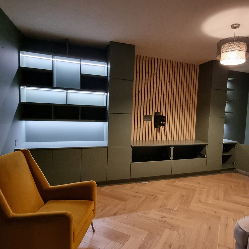 This media room was designed to feel warm, comfortable and immersive. The client wanted a dedicated space for relaxing, watching films and hosting family evenings with a rich, inviting atmosphere and balanced lighting. We combined a deep, calming colour palette with practical storage and carefully considered finishes to create a room that feels modern, layered and relaxed.